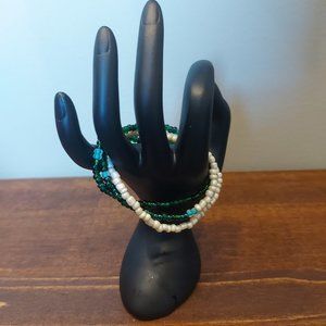 Wrap is made form Glass Czech seed beads arrange in white and green with a few turquoise highlights. Bracelet is stretchy but I'm not sure if it can be used for anything more than a wrist wrap, like an anklet.