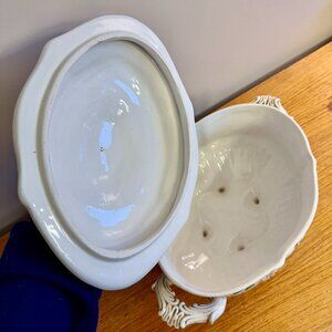 Stunning vintage "Bel For" Deruta Italy soup tureen. Ornate and well made, cream with handpainted blue and yellow florals, four feet, beautiful to look at and to use! Measures 11.5 inches long, 9 inches wide, and 11 inches to the top of the lid handle. Small chip in lid as shown in ninth photo. Will pack with the utmost care. Cat friendly, nonsmoking home.