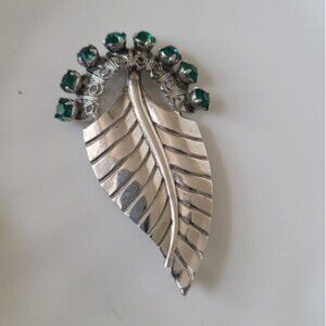 Gorgeous Vintage Retro Sterling Silver RAPHAEL Emerald Green Crystal Leaf Brooch