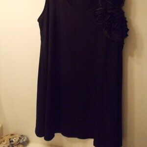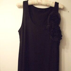 In VGUC, black tunic top in jersey knit with 3 flowers on front, lots of stretch, hardly worn, meas. 20" p to p, 31" long.