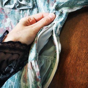 Has a side zip, and ruffles around the neck.