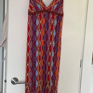 Crochet 56% cotton . Fits a little snug but does stretch. It makes the boobs look great. Brand new with tag. P to P 17”. Shoulder to fringe length 50”. To hem including fringe 57”. Will probably want to add a nude slip or dress underneath.
