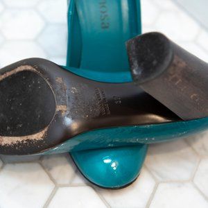 Rounded toe turquoise patent leather pumps with 3 3/4 " wooden sturdy heel. Very well made and in excellent condition. The colour is stunning!