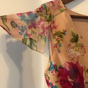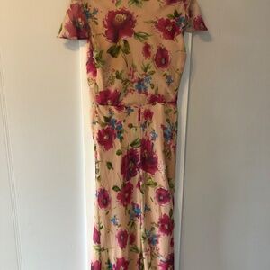 Originally purchased to attend a canceled 2020 wedding this dress has been in my closet waiting for a special occasion. It’s a nude/light pink with a sheer overlay with bright pink flowers. A back zipper makes it a figure hugging fit with no stretch. The length is long at 5ft 6 inches I would need to wear 2-3 inch heels so it doesn’t drag.