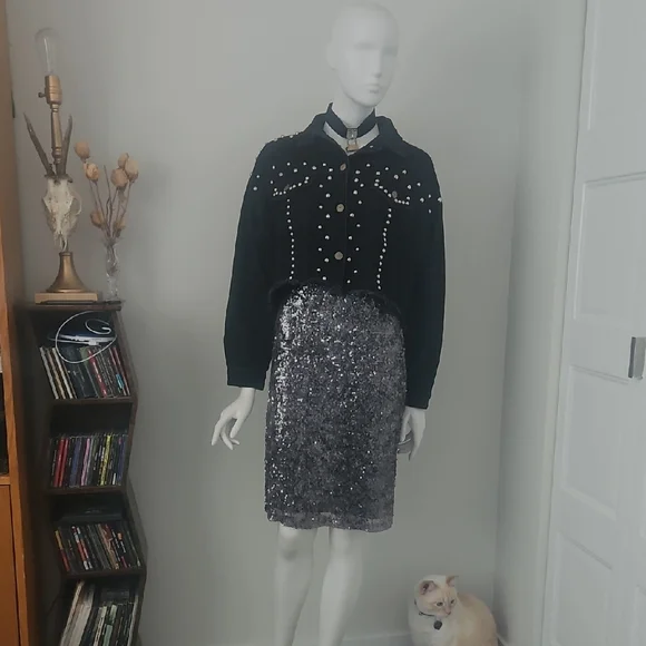 -Oversized denim jacket with studs all over. worn hem to add a distressed look