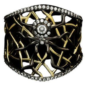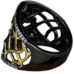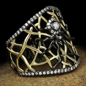 Striking gold and black tone gothic spider band ring with clear zircons. Stamped 925.