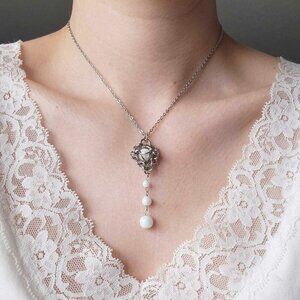 Gothic white pearl rosary necklace with a small silver chain