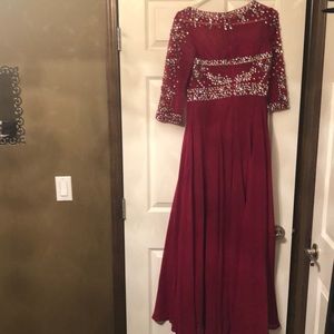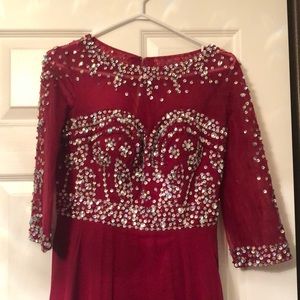Quarter length sleeve gown, made with mesh material and has jewels/sequin details on the sleeve and top half of the gown