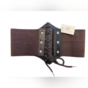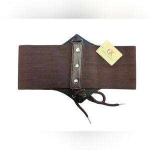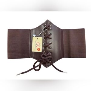 Brown in color with a triple snap closure, featuring an adjustable tie up in front. Considerable stretch available.