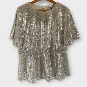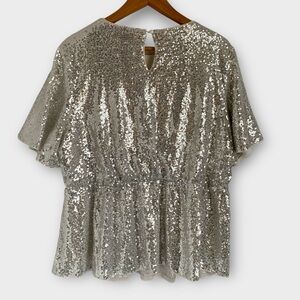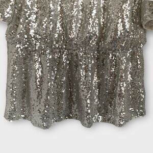 Silver metallic sequin-covered short sleeve top with a flattering peplum shape and soft stretch lining. Features a back keyhole button closure, elasticated waist, and full shimmer front and back. Eye-catching and comfy—perfect for parties, photos, or a bold night out.