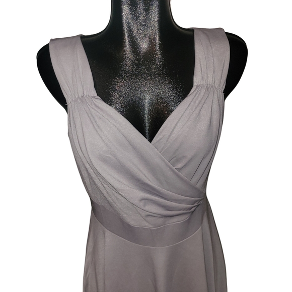 Chic sleeveless dress in a soft gray hue. Features a stylish faux wrap draped neckline. Has a hidden back zipper that goes halfway down.