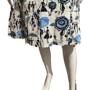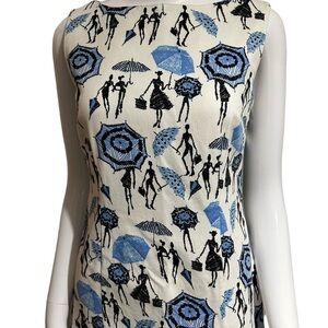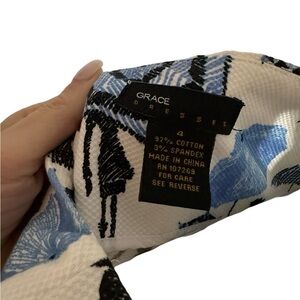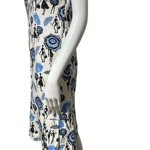Chic and elegant dress featuring a unique pattern in blue and white. Perfect for any occasion. Excellent newly used condition only worn a few times this is a size 4 however, I will say it does fit more like a size 6.