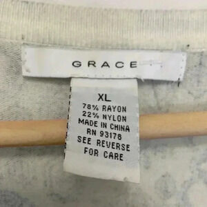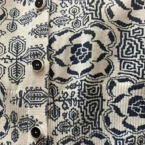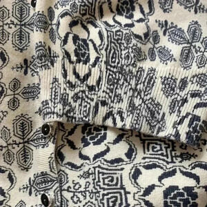 This sweater is khaki with a black pattern. Well constructed with ribbing at the bottom of both the trunk and sleeves. Buttons down the front. Hand wash, wrinkle resistant material. Lots of stretch.