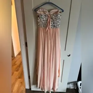 Size small. Has a corset back and hidden slit at the front. Was dry cleaned prior to storing in a plastic bag.