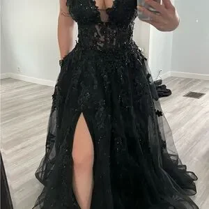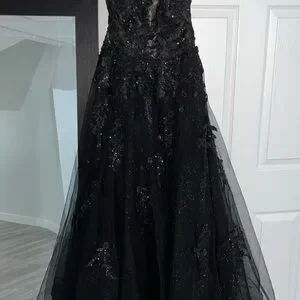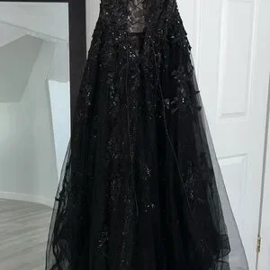 Size 8/Medium (size can alter due to adjustable back), Black, sparkly, lace, Amarra brand dress that has been worn only once, purchased from CKLY for 980$. It’s flowy on the bottom but not too poofy with a corset like top, the style is considered A-line. Perfect for bigger chested girls (for reference I’m DDD) it has deep pockets on the side and a slit for your leg.