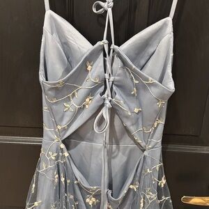 Charming blue strapless dress with delicate white floral embroidery. Sweetheart neckline and fitted bodice create a flattering silhouette. Lightweight layered skirt adds movement for events and celebrations. Elegant blue styling perfect for parties and weddings.