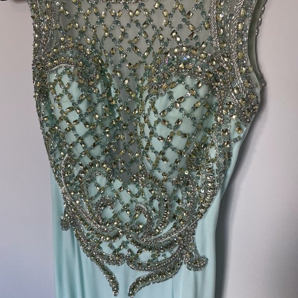 Light blue dress with a slit. Jewelled top