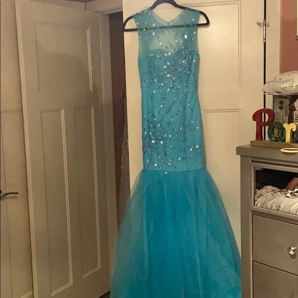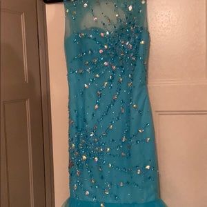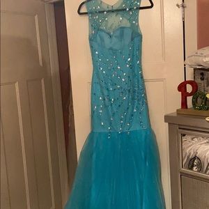 Graduation Dress- sky blue with silver sequenced jules. Mermaid fit- size 2. Bra padding built in. Open back. Worn once. In really good condition.