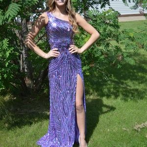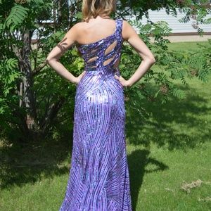 Gorgeous gown, sequence throughout, vibrant purple, fitted with left leg slit.