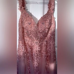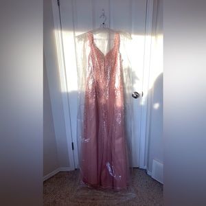 A beautiful size 14 graduation/prom dress for sale. It was only worn once for a couple hours, and is in nearly perfect condition. There is a leg slit and the skirt is is very sparkly. The dress has been altered to add a corset back, which makes the waist adjustable. The top is a sweetheart neckline with slight boning for support. The boddice is covered in crystals and pearls.