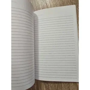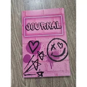 This is a new, unused notebook without tags or original packaging. The cover features a pink brick pattern with black star and smiley face graphics. The notebook contains lined pages.