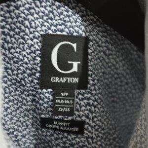 Blue dress shirt with a subtle all-over pattern. Features a slim fit cut, long sleeves, and button-front closure. The shirt appears to be in excellent used condition, with no visible signs of wear or damage. Made by Grafton, known for quality men's dress shirts