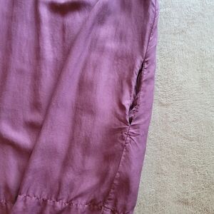 Burgundy silk sleeveless dress with racerback and ruffle at the collar that goes into ties at the back, side pockets. In good used condition
