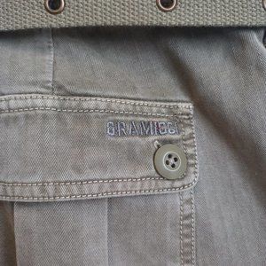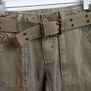 These pants include a belt and are made of a cotton blend fabric. They are very durable and great for hiking.