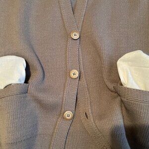 Grandfather Cardigan - VTG - Moores (made in Canada ) taupe/dark beige sweater – Size L - excellent condition ,“V” styled sweater - 4 buttons front , 2 small lined pockets in the front , ribbed sleeves and hem, roomy, slight dropped shoulder look – measurements from under the arms - 23” chest, 15.5 side length includes ribbed hem, 19” under arm sleeve length, 27” back length -neck to bottom of hem - smoke/free home - make an offer, fast shipping - bundle and save $$$