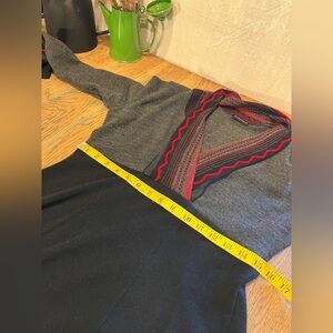 Stylish and comfortable, this medium-weight knit dress by Luc Fontaine features a flattering empire waist cut. The top is charcoal grey with a deep V neckline, highlighted by intricate red and black zigzag trim, while the skirt is solid black. Long sleeves are accented with matching decorative stitching. Made in Canada from a soft acrylic blend. Size M.