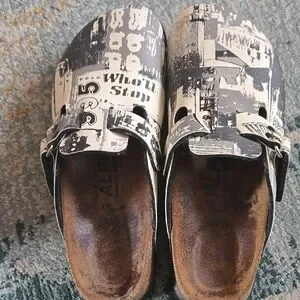 Stylish clogs with a unique graphic print. Features a mix of black and cream colors.