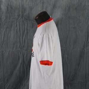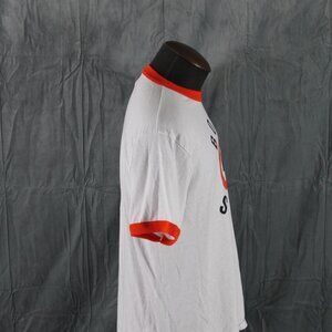 Up for sale is a graphic t-shirt. It has a white base colour with orange trim. The front of the shirt has the Boat Sauce hot sauce label logo screened on. What a great shirt do not miss out on it.