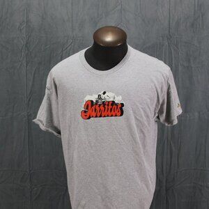 Up for sale is a graphic t-shirt. It has a grey base colour with a graphic of a skateboarder on the chest with Jarritos underneath. The left sleeve has the Jarritos logo screened on. What a great shirt do not miss out on it.
