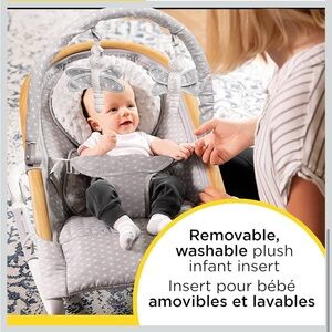 [EASY CLEAN]- The infant rocker’s seat pad and plush insert are machine washable for easy maintenance when accidents happen.
