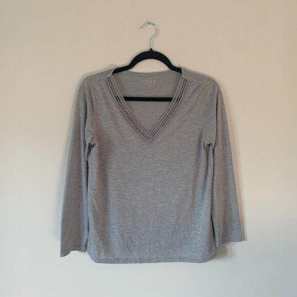 Gray Braided V-Neck Long Sleeve T-Shirt
