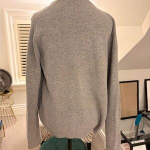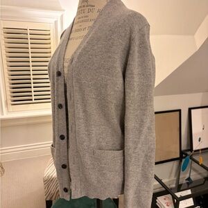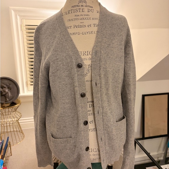 Cozy gray cardigan with button-up front. Features two pockets for convenience.