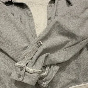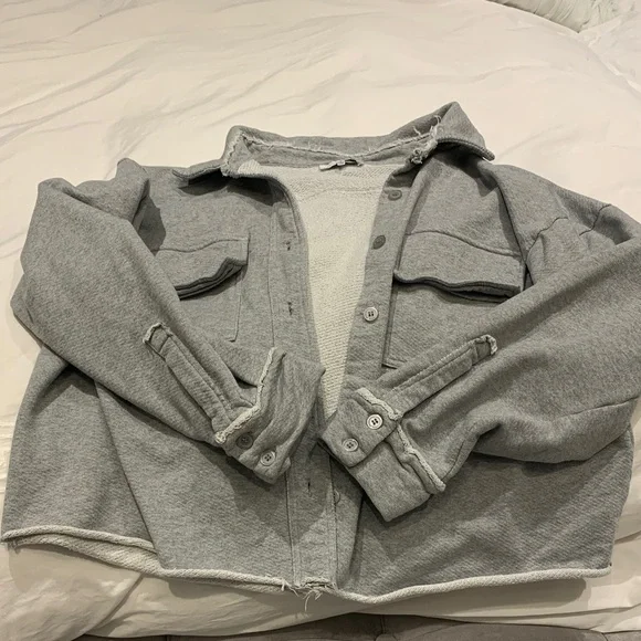 Stylish gray button-up jacket with front pockets. Perfect for layering. 100 percent cotton.