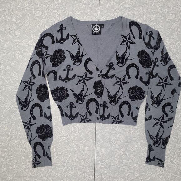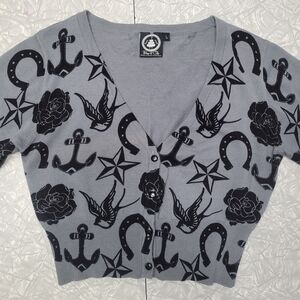 Cropped gray cardigan featuring bold nautical print with anchors, horseshoes, and stars. By Too Fast brand Banjo & Cake