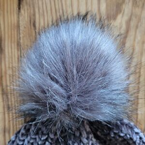 Stylish gray knit beanie featuring a faux fur pom pom on top. Perfect for cold weather. Beautifully soft feel. New without tags.