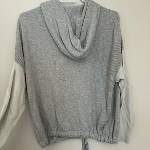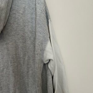 Stay cozy and stylish with this elegant gray and cream crew neck sweater. Perfect for any casual outing.
