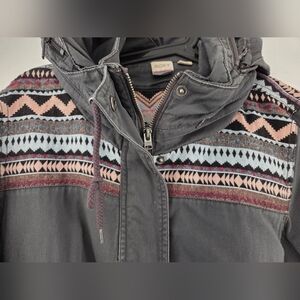 Stylish gray hooded jacket featuring a colorful tribal pattern on the shoulders. Perfect for casual wear.