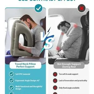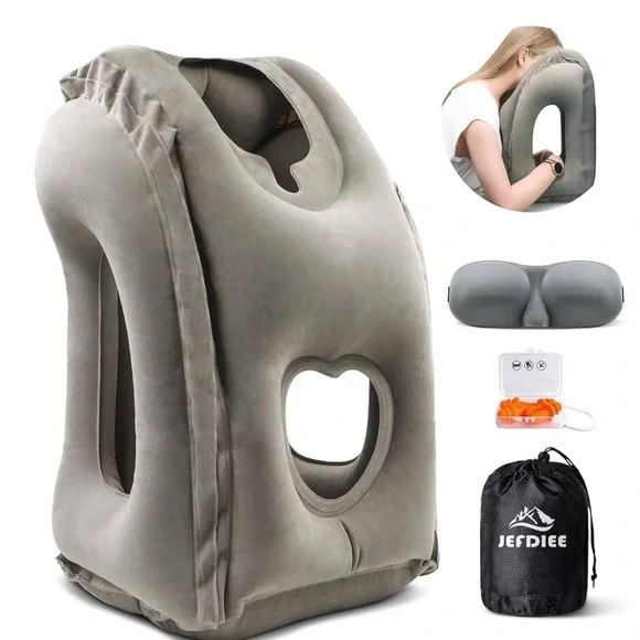 Comfortable gray inflatable travel pillow. Ideal for long journeys. Includes carrying bag.