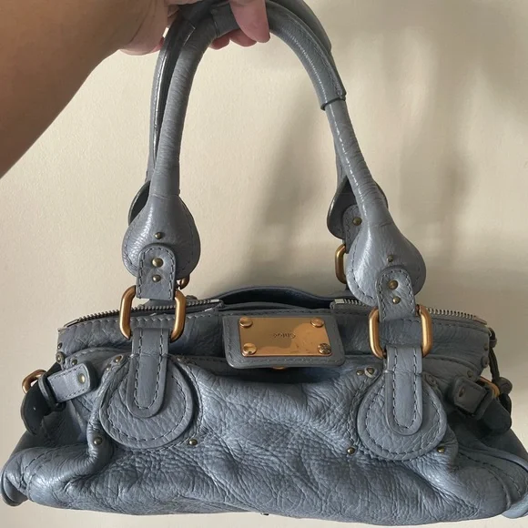 Elegant gray leather handbag with gold-tone accents. Perfect for any occasion.