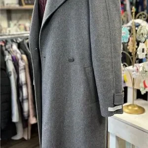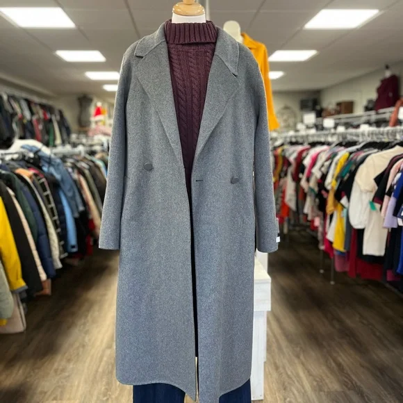 Stylish gray long lightweight wool blend overcoat. Perfect for layering.