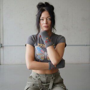 brand new handknitted gray multicolor wrist length fingerless texting gloves with half thumb.