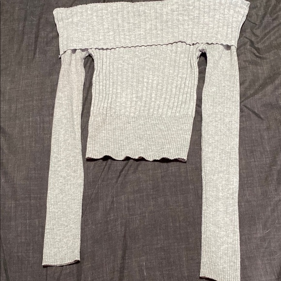 Stylish gray off-shoulder ribbed sweater. Perfect for casual outings.