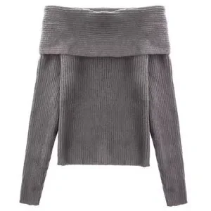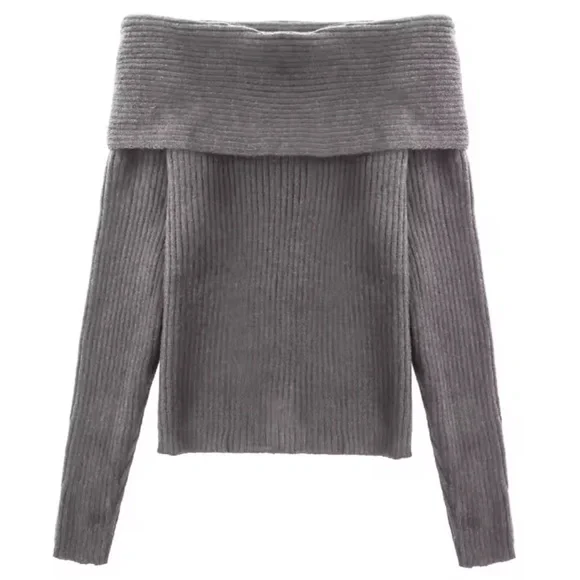 Stay cozy and stylish with this elegant gray off-shoulder ribbed sweater. Perfect for any occasion, it offers a chic and comfortable fit.
