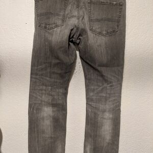 These gray jeans feature a relaxed fit, offering a comfortable and casual style. The natural wear patterns and fading give them a unique, lived-in appearance. Perfect for a laid-back day out, these jeans combine comfort with a modern aesthetic. #bootlegger #denim