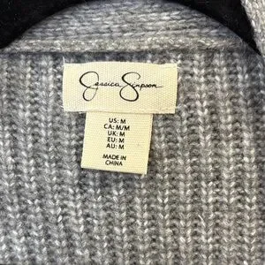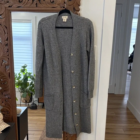 Stylish gray ribbed cardigan with button-up front. Features long sleeves and front pockets. From pet and smoke free home.