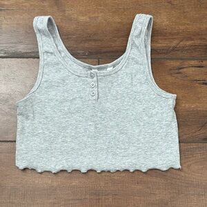 Stylish gray ribbed crop tank top with button detail. Perfect for casual wear.